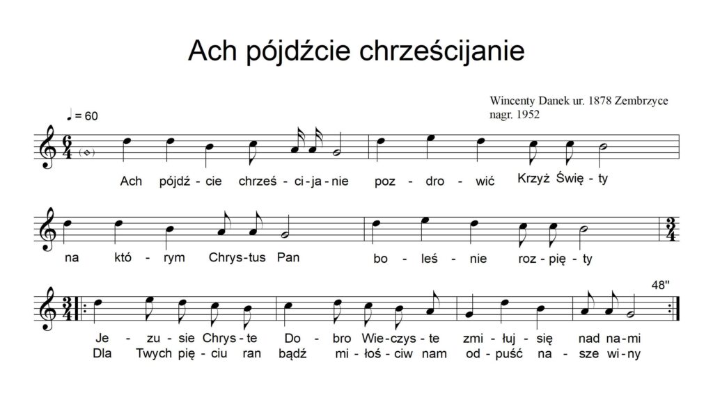 Wielkopostna pieśń kalwaryjska, znana ze Śpiewnika Kalwaryjskiego wydawanego przez oo. Bernardynów w sanktuarium w Kalwarii Zebrzydowskiej. W wersji Danka widać bardziej archaiczny tekst słowny niż we współczesnych edycjach.
