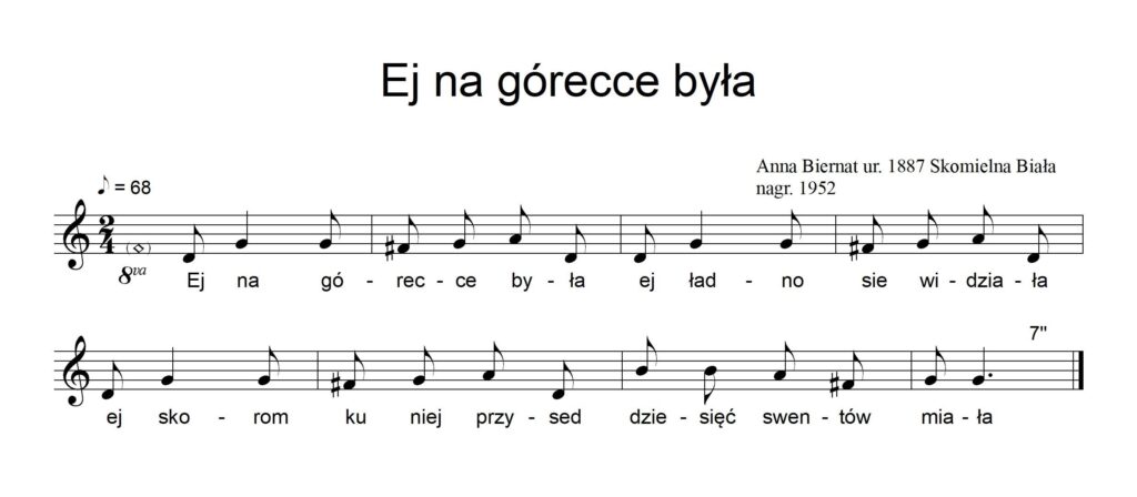 W protokole do nagrania czytamy, że ta żartobliwa pieśń pochodzi z Ponic koło Rabki, a „swenty” oznaczają „dzioby” (?). Być może chodzi o zęby („dziesięć zębów miała”). W repertuarze górali zagórzańskich funkcjonuje tekst słowny Na górecce była/ ładno sie widziała/ skorok przysed ku ni/ jedyn zombek miała, zob. S. Stopa, Śpiewnik Zagórzan Ziemi Orkana, Gminne Centrum Kultury w Niedźwiedziu, Konina 2006, s. 61 (3. zwrotka pieśni Za las chłopcy za las), natomiast w repertuarze muzycznym górali żywieckich tekst Hej na wirsku siedziała/ pieknom sie widziała/ hej jakzem do niej przysed/ jeden zombek miała, zob. J. Mikś, Pieśni ludowe Ziemi Żywieckiej , wyd. Towarzystwo Miłośników Ziemi Żywieckiej, Żywiec 1990, s. 476.