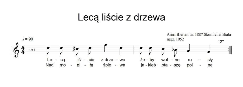 Tekst słowny patriotycznej pieśni Lecą liście z drzewa to wiersz Śpiew z mogiły Wincentego Pola, do którego Fryderyk Chopin napisał w 1836 r. muzykę (pieśń Leci liście z drzewa op. 74 nr 17). Oba dzieła – i Pola, i Chopina – były wyrazem żałoby po klęsce powstania listopadowego, zrywie niepodległościowym współczesnego im pokolenia Polaków. W wersji skomielniańskiej pieśń jest skrócona, a w tekście słownym ma poprzestawiane wersy oraz odmienną od chopinowskiej melodykę.