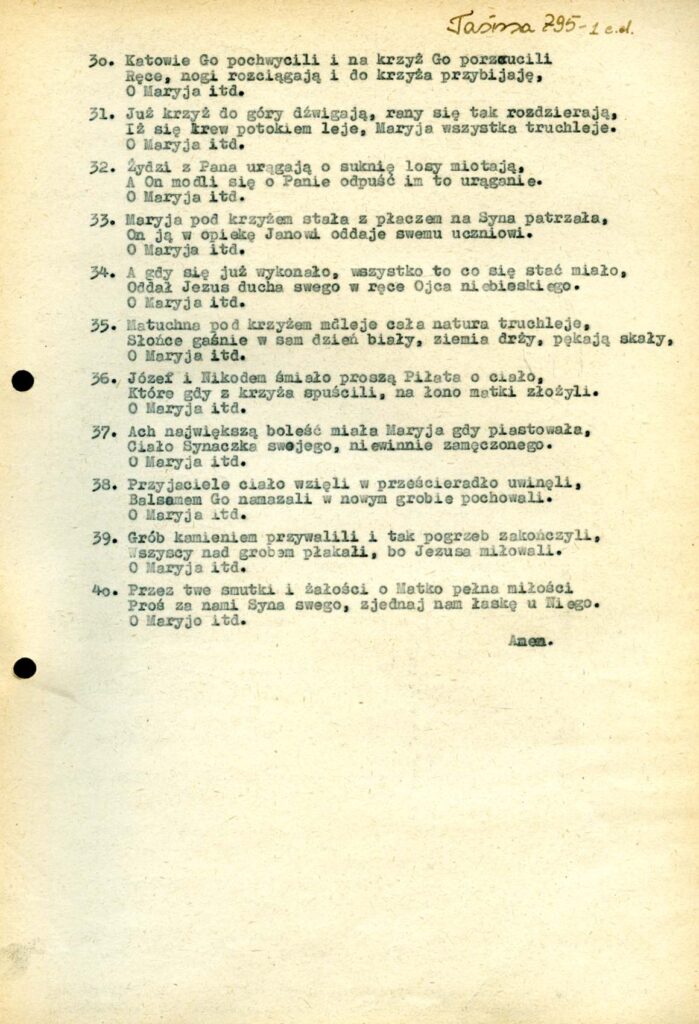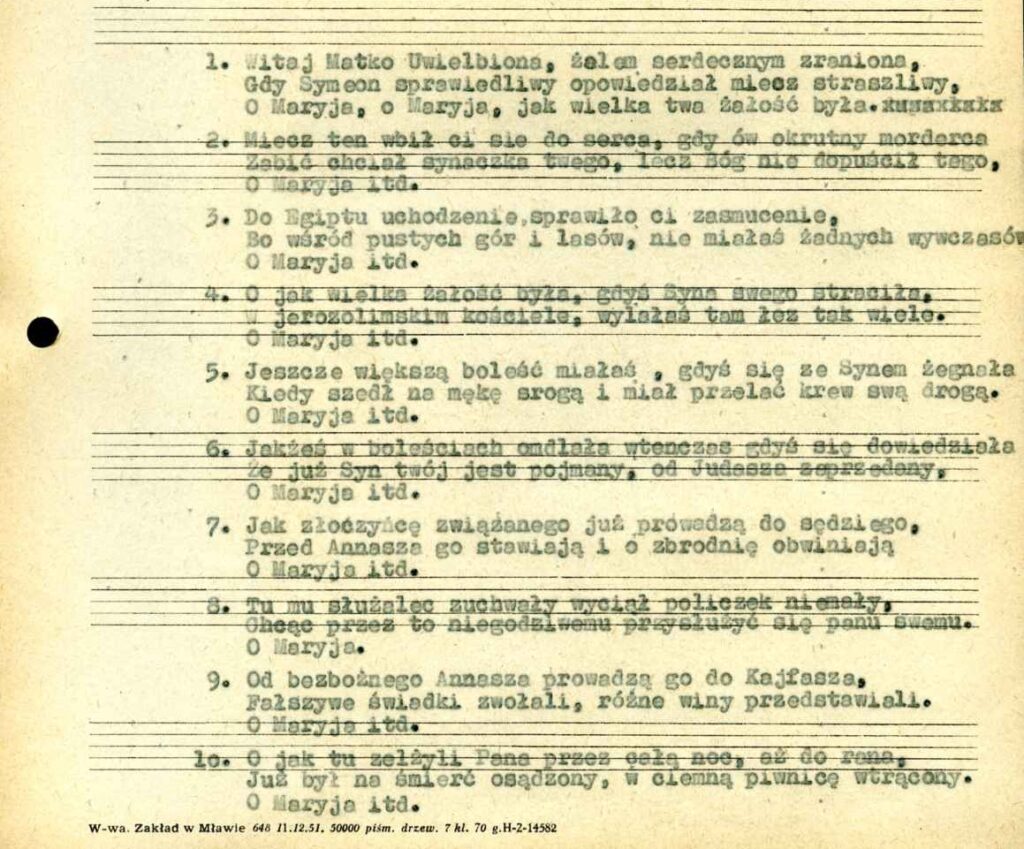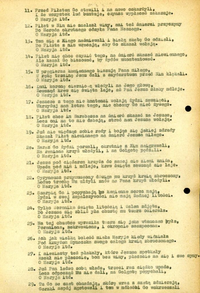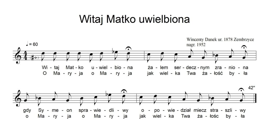 Jest to jedna z najpopularniejszych, najpiękniejszych i najdłuższych pieśni kalwaryjskich opowiadających o boleściach Matki Bożej. Mogła być śpiewana podczas kalwaryjskich Dróżek przy IV stacji. Poniżej zapis tekstu słownego z protokołu do nagrań: