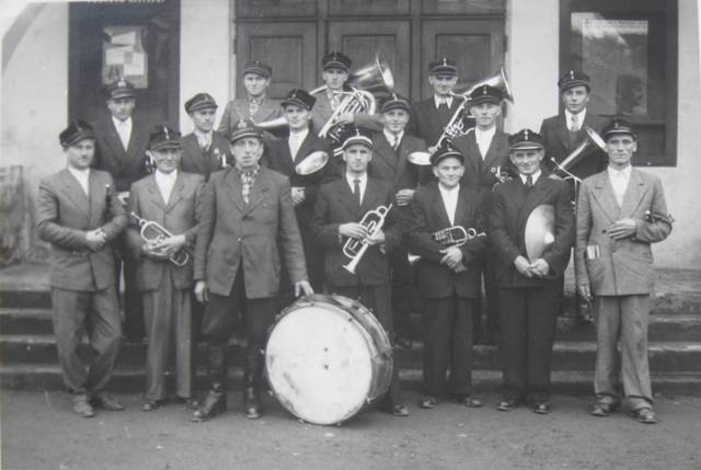 Orkiestra dęta ze Skomielnej Białej, Myślenice, 1958 r. Franciszek Macioł stoi w pierwszym rzędzie, za bębnem. Zdjęcie ze zbiorów prywatnych córki F. Macioła, p. Ireny Gacek.